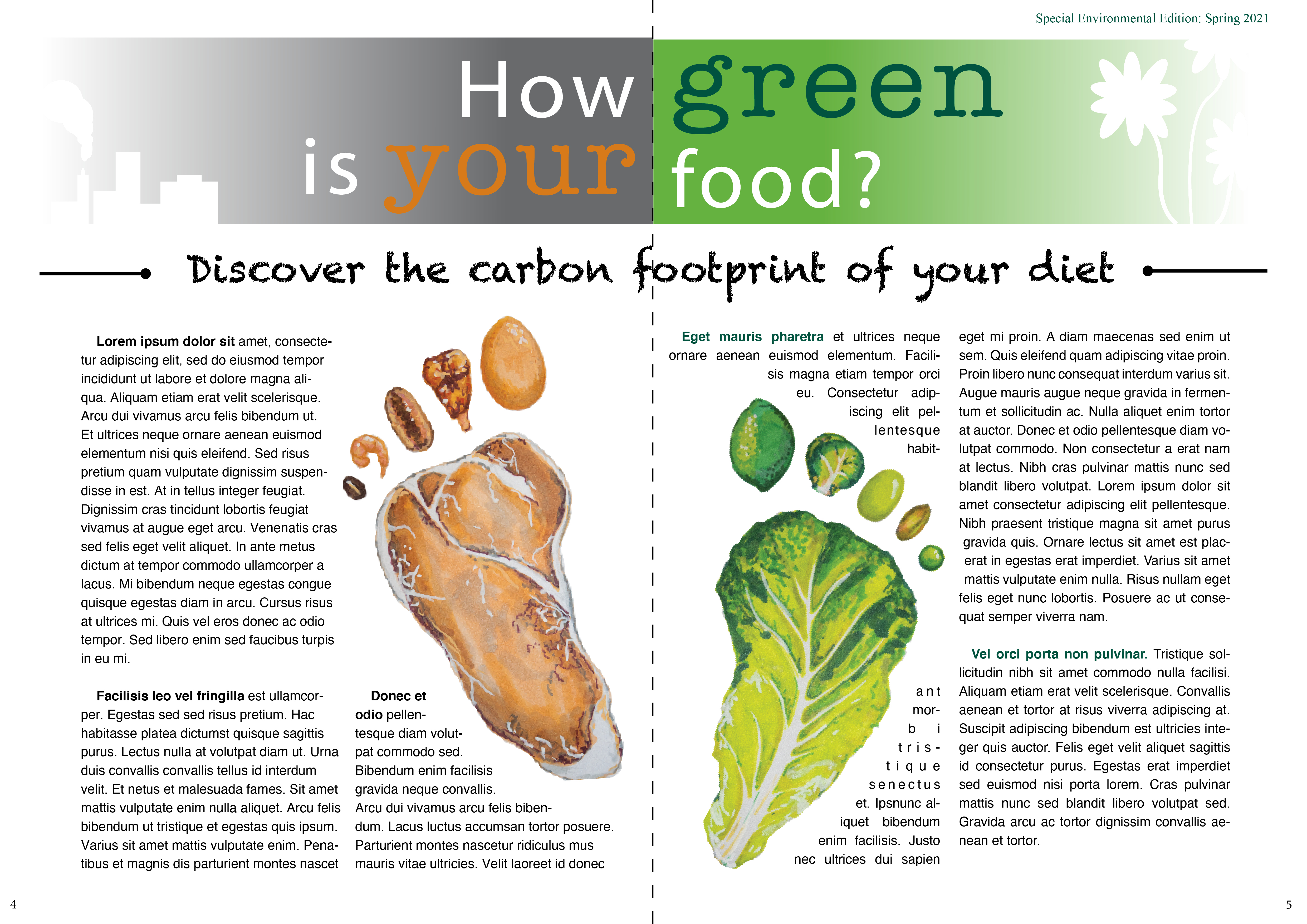 I tried different font styles, colour schemes and started to construct detail like lines with the subheading, adding page numbers, an edition version header. The red and green was a little bit too Italian flag and the black works well to symbolise black carbon and was a little more elegant. I tried more different greens, went back to a browner meaty colour and even tried grey as per the below and tried also making the footprints not entirely symmetrical too, for a more dynamic look and added more dark green to the title font.