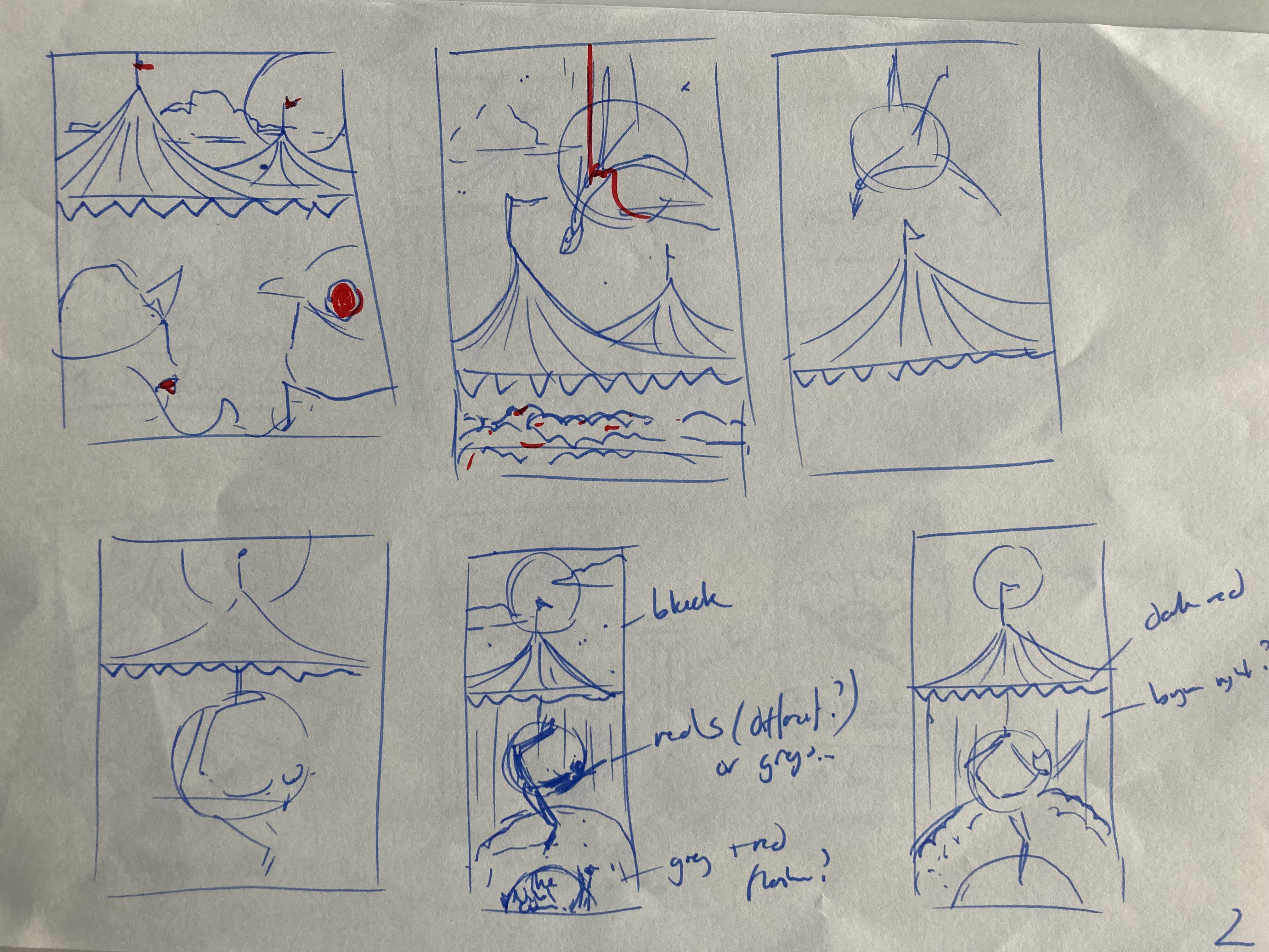 I then worked on some thumbnail ideas for a composition bringing in some of these elements together: I went for using the iconic tent and given the night aspect, the greys blacks and red this made me imagine more of an elegant, mysterious style of circus and rather than jugglers or animals, I wanted to do an elegant aerial dancer or trapeze artist – also noting that not many people like to see animals. So on that basis I played around with ideas for composing this as per the below: