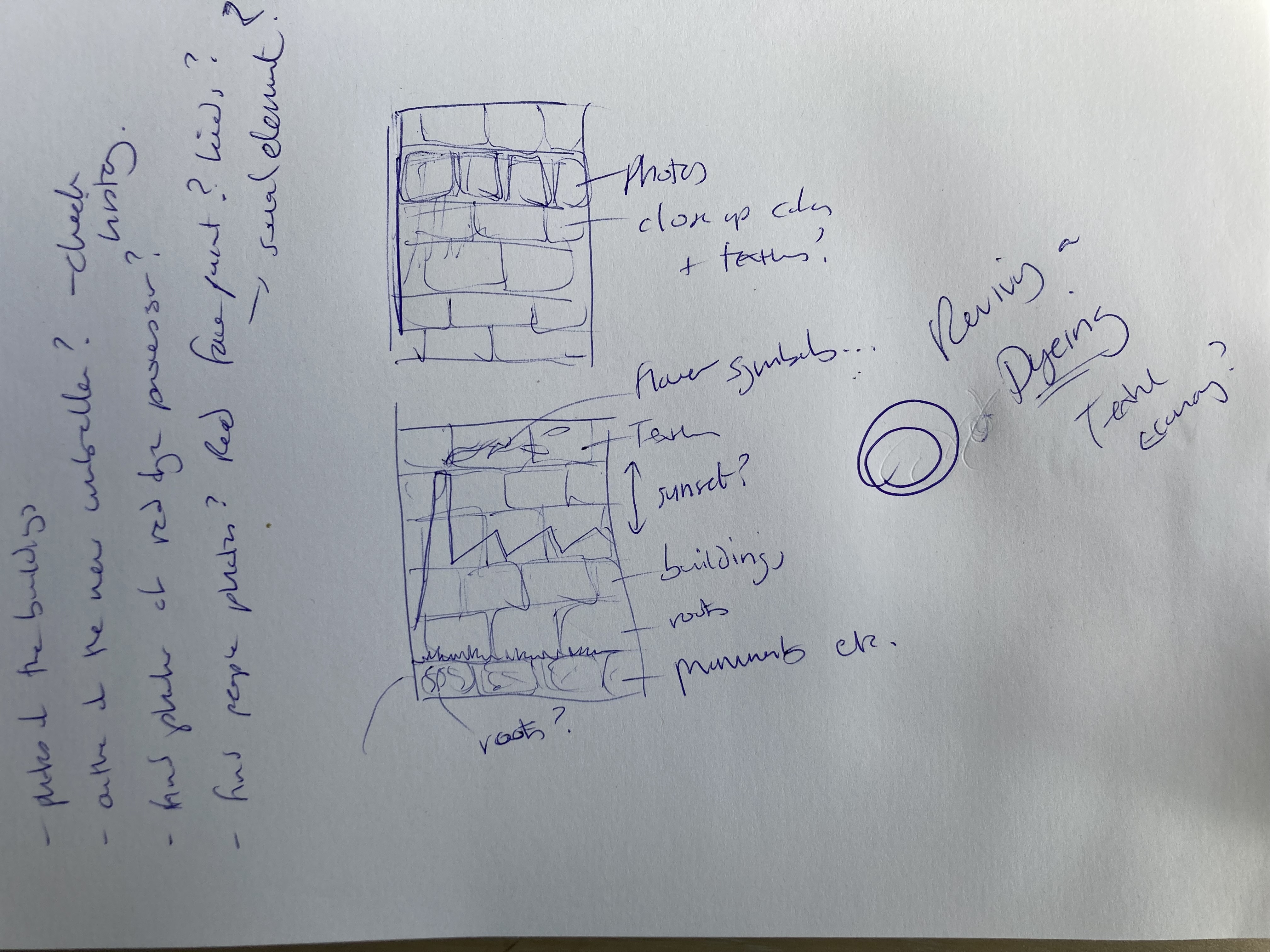 One key thing I kept coming back to was the different bricks and reds of all the buildings, or using roots and plant of the madder plant and also of textiles themselves, in reds. This idea of the heritage through buildings that are still standing, reflecting the local quarries, Victorian style and industry of the time and the local economy was what captured my attention most. I thought about using the photos to build a brick wall full of colours and hues of red from the area: